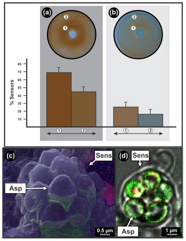 Sensors are characterised by various smooth spherical ascospores of about 2 μm in diameter all enveloped by a cell wall (Figure 2(c,d)). This is exposed by sensor disassembly using Ar+ etching and NanoSAM in SEM mode (Figure 2(c)). Here Auger nano-probing shows remnants of gold (in green) on sensor wall (from gold sputtering during NanoSAM preparation) as well as element composition of ascospores (i.e., carbon in blue and oxygen in pink). As expected [] these sensors have increased mitochondrial activity indicated by increased fluorescence associated with ascospores (Figure 2(d)). Here no smart mechanics, as is evident in the other sensing yeasts, were observed.