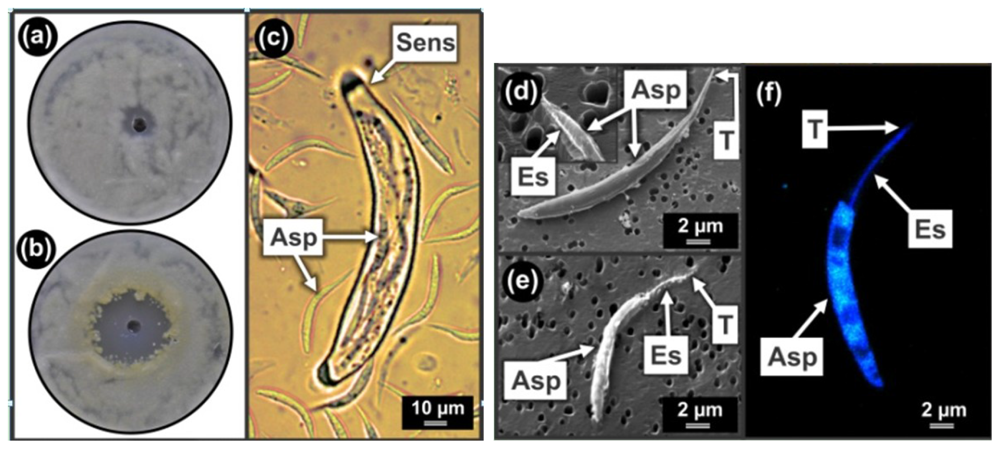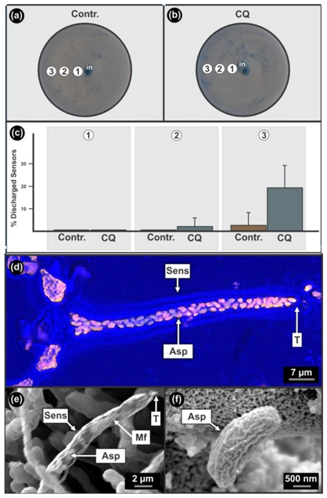 These sensors are bottle-shaped structures containing coiled micro-fibrils, each with a narrow opening at the tip, allowing the release of only one ascospore at a time, and a broader base containing many ascospores (Figure 4(d,e)). Discharged sensors are formed when elongated grooved ascospores of about 1 μm in diameter (Figure 4(f)) are individually released from sensors (Figure 4(e)) through tight fitting narrow sensor openings of about 1–2 μm in diameter (Figure 4(d)). Ascospore release occurs by smart ascospore rotation mechanics affected by micro-fibril coiled rifling and lubrication by anti-mitochondrial drug sensitive, β-oxidation products such as 3-OH oxylipins []. These smart sensor mechanics can be viewed as a movie in video lecture format [,,]. We conclude that since chloroquine had an enhancing effect on ascospore discharge from sensors, it should be pro-mitochondrial, probably also enhancing beta-oxidation at lower concentrations—especially since blocked sensors that were filled with well developed, unreleased ascospores, were formed at higher concentrations of this drug (results not shown). Whether chloroquine has a direct or indirect effect on mitochondrial activity should now be investigated.