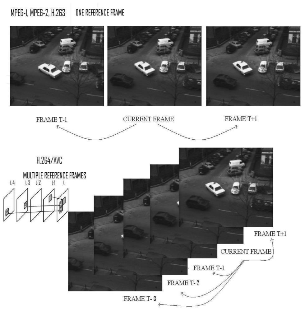 The International Telecommunication Union (ITU) developed a number of video coding standards for real-time transmission applications (such as video conferencing). The first major aim of the ITU was H.261, designed for transmission over ISDN lines with data rates in multiples of 64 Kbits/s. ITU has published a series in the H.26X family, such as H.263+ [1,2]. As well, the International Organization for Standardization (ISO) and the International Electro-technical Commission (IEC) established the Moving Picture Experts Group (MPEG) in order to set standards for audio, video compression, and transmissions such as MPEG-1, MPEG-2, and MPEG-4 [3,4] (MPEG-1 aims to meet the low complexity requirement, MPEG-2 is meant for broadcast-quality television, and MPEG-4 is especially designed for low bitrate applications). In 2001, The Joint Video Team (JVT) joined the ITU-T Video Coding Experts Group (VCEG), and ISO/IEC MPEG started the development of a new video coding standard, H.264/AVC [5–7], completed in 2003. Commonly known as MPEG-4 Part 10, the standard H.264/ Advanced Video Coding (AVC) provides good video quality with lower bitrate than previous coding standards, though at the expense of notably increasing the design complexity. In earlier coding standards, such as H.261 and MPEG-1, working with one reference frame, H.264/AVC supports multiple reference frames, as Figure 1 shows.
