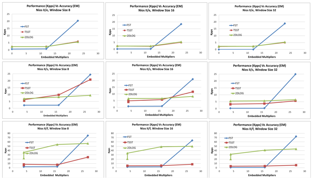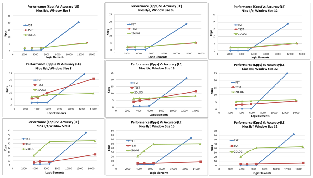 As we can observe, for NIOS II/e and NIOS II/s processors, FST algorithm achieves less kpps with the same logic elements than with TSST and 2DLOG in all acceleration types, except in the case of high acceleration in which FST achieves better performance than any other using less logic elements.