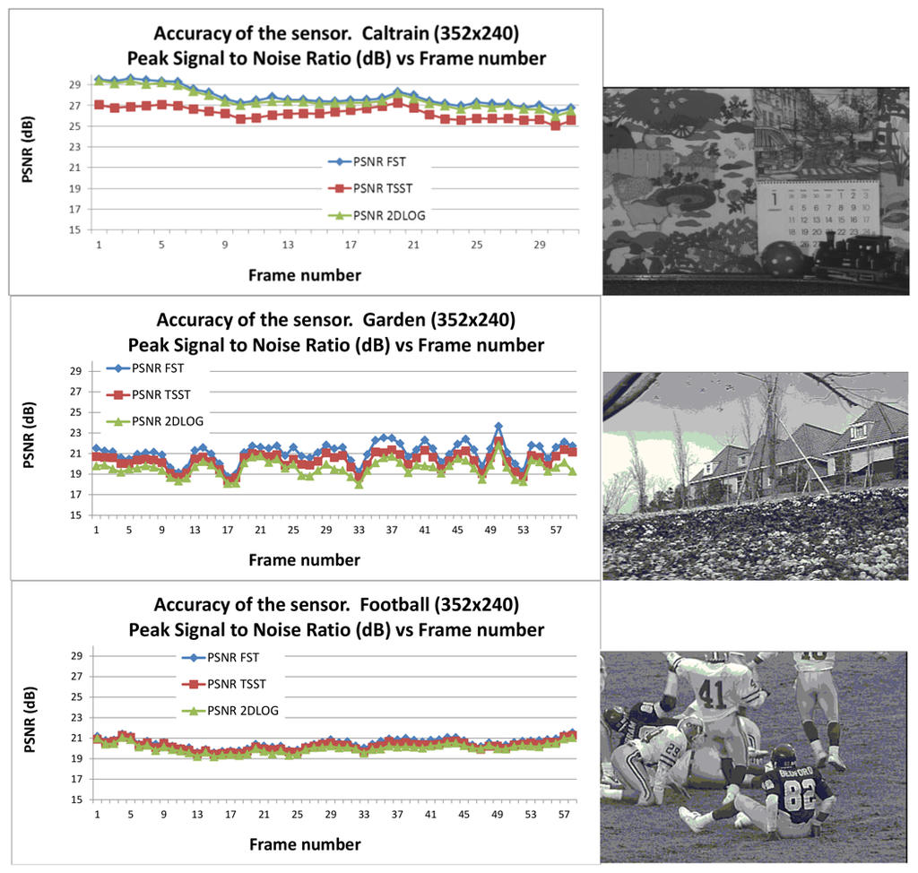 The value of the PSNR for three different sequences as Caltrain, Garden, and Football deeply used for testing motion estimation sequences [54] with a resolution of 352 × 240 pixels (4:2:0 and SIF format) as shown in Figure 12. As is evident, the accuracy of the implemented FST configuration remains the highest for the three cases. The TSST and 2DLOG configurations alternate in terms of accuracy, the difference between the three implementations lower than 2 dB.