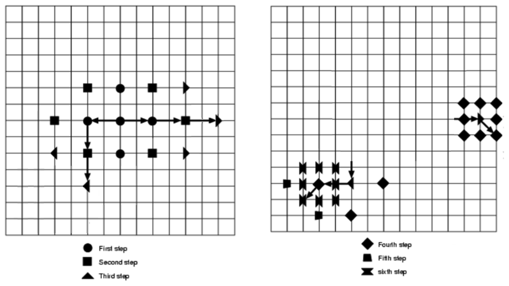 As an example, two different search paths are shown in Figure 4. When the step size is reduced to 1, all eight of the checking points adjacent to the center checking point of that step are searched. The bottom search pathway needs 23 = 5 + 3 + 2 + 3 + 2 + 8 checking points through the six steps to complete the process; nevertheless, the top search pathway requires 19 = 5 + 3 + 3 + 8 checking points.