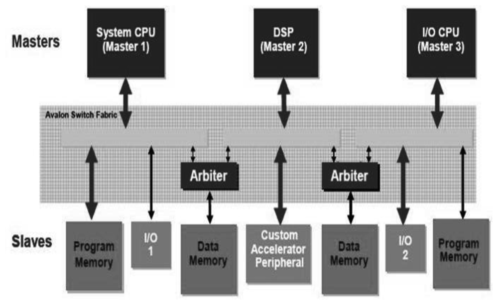 Usually the processors share a single system bus with DMA channels and other master functions, limiting bus access to only one master. NIOS II systems benefit from the so-called Avalon Switch Fabric [53] that provides, as shown Figure 6 (right), a dedicated data path to each master, allowing all masters to transfer data simultaneously, which delivers greater system performance. This bus supports a plethora of characteristics, such as address decoding, dynamic bus sizing, clock domain crossing, off-chip interfaces, and datapath multiplexing. Large blocks of data can be processed concurrently with CPU operation constructing application-specific hardware accelerators, boosting the system throughput due to dedicated datapaths. The performance of the embedded system not only depends on the frequency or benchmarks but also on the surrounding system.