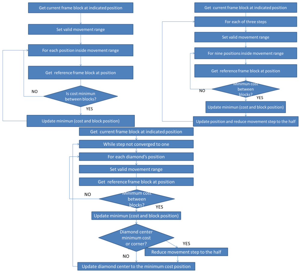 We provide, in the following paragraphs, an overview of the matching algorithms, focusing on three specific ones chosen for their peculiarities while being implemented. The aim of Block-Matching Methods (BMMs) is to estimate Motion Vectors for each Macro Block within a specific and fixed search window in the reference frame [17,20]. For example, the Full Search Technique (FST), also denoted as an exhaustive search algorithm, is one of the most straightforward methods in BMMs. The FST algorithm exhaustively matches all Macro Blocks within a search window in the reference frame to estimate the optimal Macro Block; i.e., the one with the minimum Block-Matching Error (BME). There are several definitions for BME, but the most used is the Sum of Absolute Difference (SAD) of all the pixels between an MB of the current frame and that of the reference frame and the Mean Squared Error (MSE), this last metric being less conservative due to the square factor. Usually, the huge amount of computations required to calculate the error by the FST limits its applicability, turning the development of efficient motion estimation search algorithms into a significant topic for video coding.