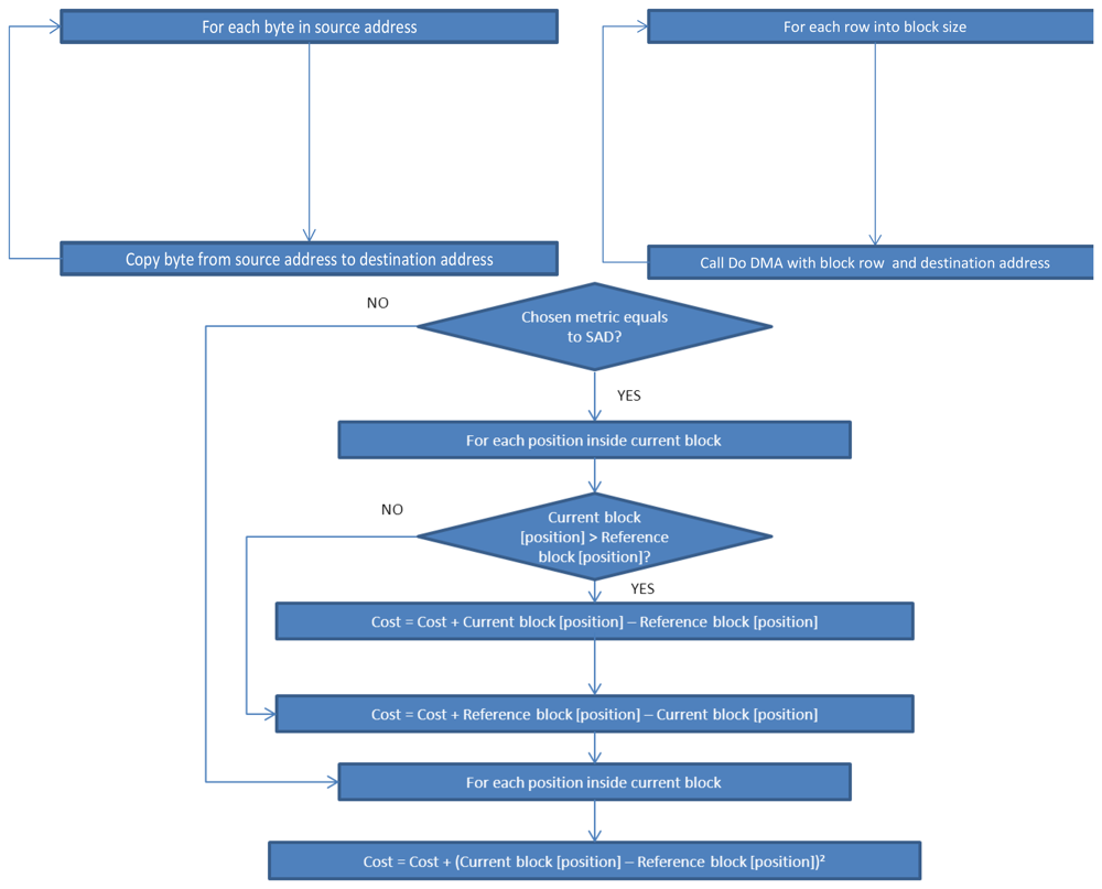 Next, the functionality of the algorithms implemented in the sensor is briefly described and shown (Figures 7 and 8). The three first Algorithms (I, II, III) correspond to the techniques represented in Figures 2 through 4. Additionally, Algorithm IV moves data in memory; Algorithm V gets a specific MacroBlock (MB); and, finally, Algorithm VI delivers the accuracy of the motion estimation in the sensor itself:
