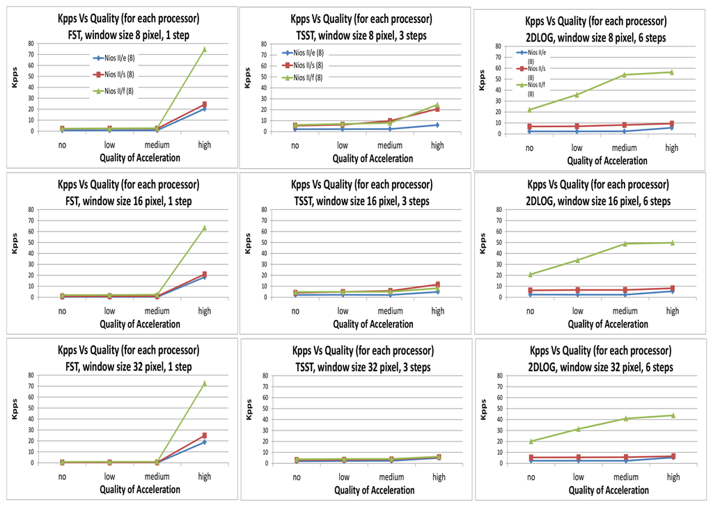 The throughput of the whole system with low or medium acceleration behaves similarly when comparing the execution of the whole functions in embedded software (no acceleration) under the NIOS II and the FST technique, as shown in Figure 9. If we focus on the TSST technique, this behavior becomes lineal (when considering no, low, and medium acceleration). If we see the 2DLOG technique, the linear response is emphasized again for no, low, and medium acceleration, as well as the fast architecture (NIOS II /f). Although every throughput for every architecture depends on the window size (8, 16, and 32 pixels, respectively), the linear tendency of all responses remains constant for all sizes. We notice, for instance, that by using only medium acceleration (Algorithms IV and V), the 2DLOG technique and fast architecture (NIOS II /f) is obtained as throughput range between 16 and 21 Frames per second (Fps) at a 50 × 50 pixel resolution when using different windows sizes.