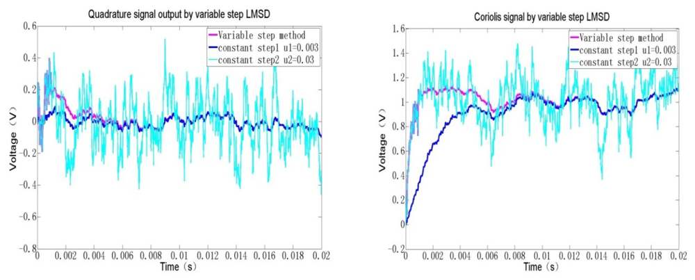 As can be seen from Figure 9, the two direct current terms, which reflect both the Coriolis and quadrature components, can be obtained through a concise iteration algorithm. Obviously, the demodulation results can be rapidly converged to two constant values after 200 loops. The sample rate is high up to 300 kHz, so the interval time is about 33 μs. In actual system, a high-resolution 18-bit A/D converter is selected, therefore, the quantification error in the full range of ±2.5 V is about 0.019 mV, which exceeds far beyond the equivalent angular rate noise. In the FPGA realization, some digital 18-bit multipliers are used to ensure the computation resolution after C/V conversion. Especially the fixed point processing method is adopted to save the limited resources and lower the power consumption. In Figure 10, the Coriolis signal and quadrature signal are calculated by basic LMSD and varying step LMSD methods.