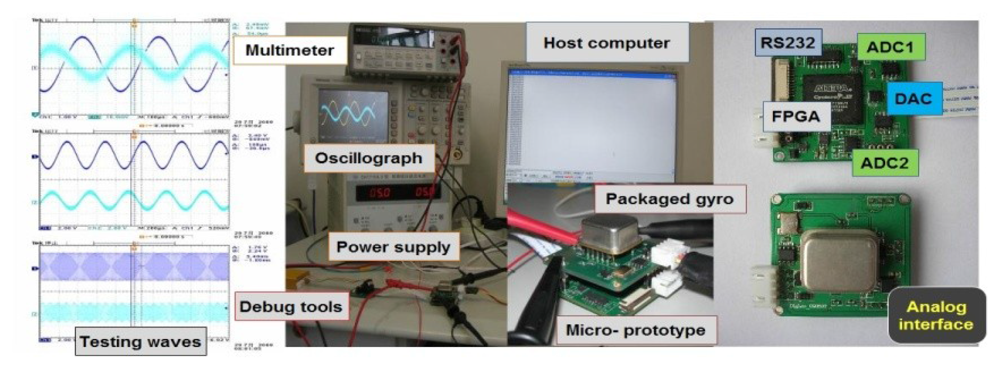 Some mature prototype microgyroscopes have been realized by analog circuit technology [1–3]. However, compared with other digital systems, they obviously lack enough flexibility and compatibility to satisfy different types of gyroscope structures and a variety of applications. Especially, the updated advanced algorithms by changing many circuit parameters cannot be easily performed in a relatively simple analog circuit. In order to further improve the overall system performance, many kinds of digital control circuits have been investigated to date. Though some novel digital systems based on DSP (digital signal processor) have been achieved [4,5], there are some great advantages in using FPGA instead, especially considering its faster parallel speed and lower power consumption, which will greatly better its whole performance eventually. Though a typical digital system based on FPGA was presented in [6], the conversion accuracy was only 12-bit that will inevitably cause much quantization noise and make the signal accuracy poor. In [7,8], a hardware platform for intelligent tuning, model identification and closed-loop operation was developed and tested over a generation two JPL/Boeing pyrex post resonator MEMS gyroscope. The real-time filtering and control of this device was successfully implemented through a digital design based on both a main digital ASIC and a monitoring-function FPGA chip. A software interface allows the user to configure, calibrate, and tune the bias voltages on the microgyroscope. Later on, a more advanced evolutionary computation algorithm for mode-matching tuning was further developed, and also another novel compact Disc Resonator Gyroscope was easily embedded in this compatible digital platform [9,10], which demonstrates the merits of adopting FPGA. Certainly, the JPL gyroscope based on FPGA and 24-bit sigma-delta A/D attained good performance, however, compared with a relatively high resonant frequency, the nearly 50 kHz sampling rate is so low that it may sometimes cause time and phase delay effects. In [11,12], the double closed-loop and force-feedback digital control architectures are implemented with a certain noise and stability performance by using the sigma-delta modulation in both drive and sense modes. In [13,14], with the similar sigma-delta technology, the combination of ASIC and FPGA is implemented to achieve low noise and high Signal Noise Ratio (SNR) capability. Even though the performance is obviously updated by FPGA, for some special applications, we still need to achieve its miniaturization. Based on the previous investigations, here we will offer a digital system based on FPGA with 16-bit accuracy and high processing speeds of up to 300 kHz after miniaturization, which can assure both the system resolution and avoiding processing delays. Meanwhile, all the detailed components, including algorithm simulation and verification in FPGA, will be presented to show the characteristics of our digital system in this work.
