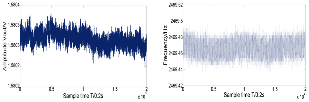 Nearly one hour of detection results of vibrating frequency and amplitude in drive mode are shown in Figure 12. The mean value of the vibrating frequency in drive mode is near 2,469.47 Hz, and its variance is below 0.01 Hz.
