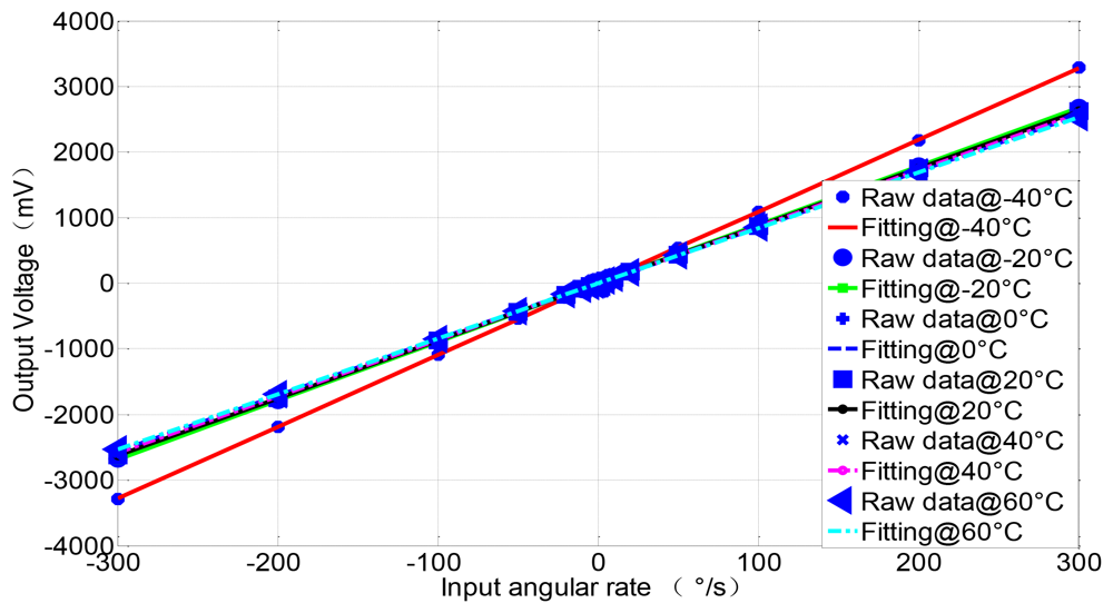 Similarly, the mean detection voltage value of vibrating amplitude in drive mode is near 1.5803 V, and its variance is 1.45 × 10−5 V, thus the stability of both vibrating frequency and amplitude in drive mode have achieved a high precision (the relative error is lower than 1 × 10−5). The testing results demonstrate the stability in drive mode and the high precision detection ability of minor signal in sense mode. With the scale factor of 8.775 mV/°/s in full measurement range of ±300 °/s, the nonlinearity is less than 400 ppm and ZRO (Zero Rate output) is very stable at room temperature. Through the overall temperature range from −40 °C to 60 °C, the maximum scale factor deviates by about 10 percent from the room temperature value, which to some extent verifies the temperature stability in harsh environment. All the experimental results can be seen from Figures 12–14.