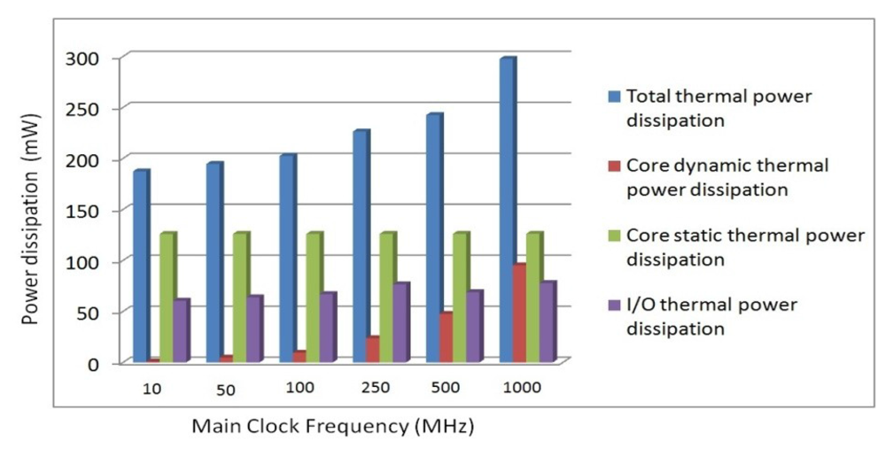 When the main clock frequency of more than 100 MHz is adopted, the core dynamic dissipation is increased dramatically, while other thermal power dissipations will not be changed too much. Thus, in order to make the core dynamic thermal power dissipation smaller, only 50 MHz main frequency is adopted in our system. For a lot of clock signals and 300 KHz sampling rate in the digital system, actually it is easy to deploy them by dividing the main frequency.