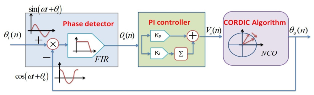 In drive mode, the driving signal and the displacement detection signal in drive mode are always perpendicular, even though the resonant frequency has a certain drift over temperature. Almost most analog or digital gyroscope circuit systems adopt the PLL technique to sustain the phase difference stability and resonant frequency tracking [15]. In order to realize such self-oscillating in drive mode, software phase-locked loop (SPLL) can achieve this function via software, which makes an output signal track the input signal by the phase difference of 90°. This special algorithm aims to synchronize the output signal with its input signal in frequency as well as in phase. As shown in Figure 3, this adopted SPLL consists of phase detector (PD), loop filter (LF) and numerical controlled oscillator (NCO), which is totally a closed-loop. First, PD is a phase comparator to catch the equivalent phase difference between the output feedback signal θo(n) and the input signal θi(n) by multiplication, and then it is filtered by FIR to appropriately generate an error signal θe(n) for the PI controller input. In the PI controller, θe(n) is both amplified by the coefficient Kp and integrated after being multiplied by the coefficient Ki, which is followed by summation. Especially, adjusting here the loop parameter can improve the overall system performance. The output signal Vc(n) of PI controller is used to control the frequency and phase of NCO. In fact, NCO is actually a numeric-frequency converter and its output frequency ω(n) varies with the digital value of control voltage Vc(n). In this design, a CORDIC algorithm-based NCO module is adopted, which will simultaneously compute the trigonometric functions such as sine and cosine. Additionally, compared with the traditional look-up table method, this method can save a load of resources and greatly lower the power dissipation in FPGA.