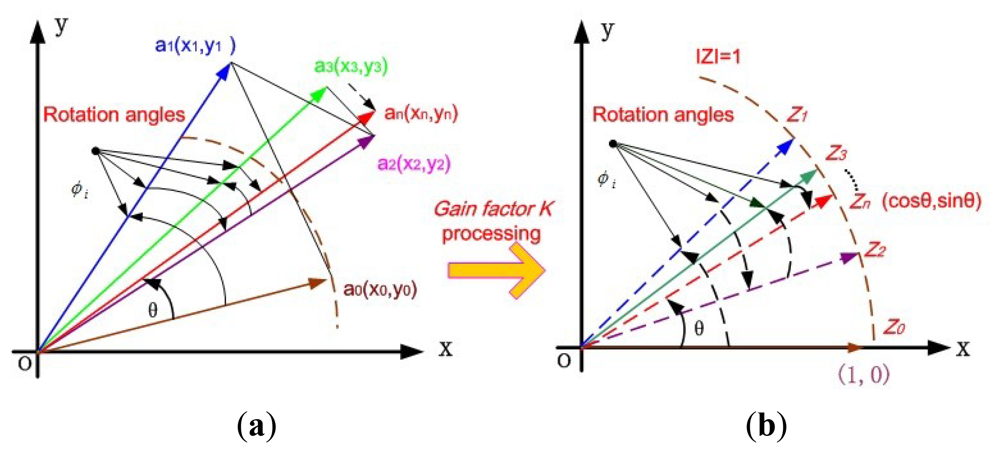 Considering each step rotation angle is a primitive set value, i.e., cos(φi) must be a constant. Thus, each step iteration calculation for any rotation angle θ can be expressed as