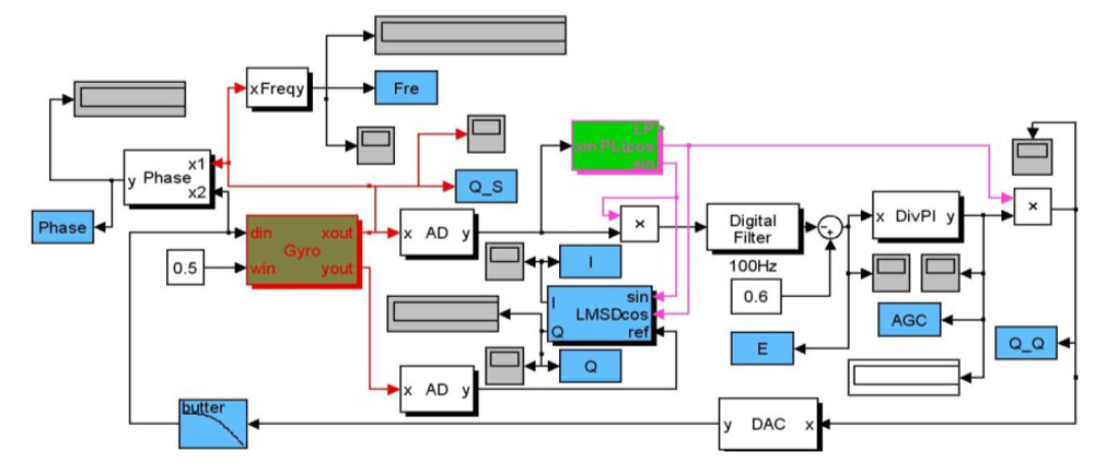 All simulation blocks in Matlab have been built as shown in Figure 5. The main modules with the abbreviated names such as Gyro, PLL, and LMSD, etc. are packaged using internal adjustable parameters. AD and DAC convertor modules are fully realized using programmable function interface with C++ tools.