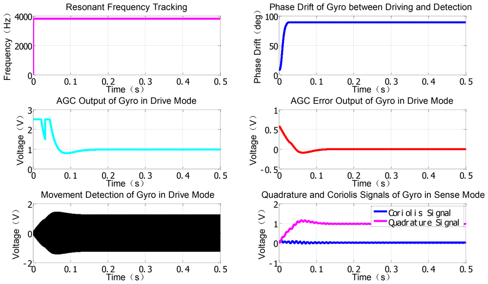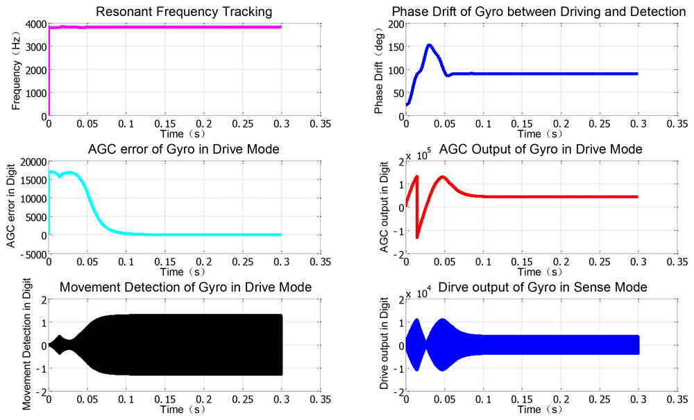 Other important modules like AGC will be implemented using the discrete multiplier, digital filter and PI modules. Besides, some instruments in gray and specific variables in blue for monitoring the real-time key signal nodes are employed to record some useful curves as shown in Figure 6. From the simulation results in drive mode, the resonant frequency is tracked fast and the phase drift is avoided when the SPLL starts to work. Only after less than 100 ms, the stable AGC control output can perform well and the AGC error rapidly converges to zero. The envelope curves of the resonant movement detection clearly prove that the AGC and SPLL are completely effective. Moreover, the demodulation results of the LSMD are in good agreement with the preset Coriolis and quadrature signals.