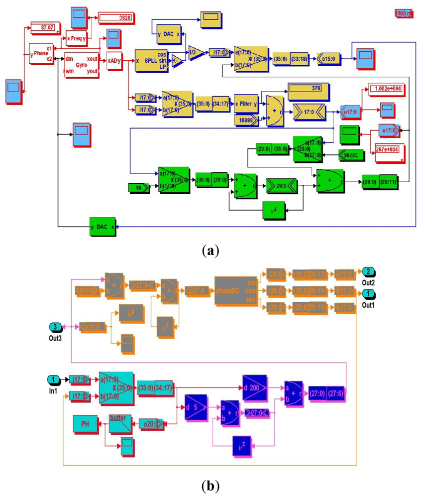 Similarly, the corresponding simulation blocks created by DSPbuilder tools can be seen in Figure 7, and the simulation results with certain fixed point algorithm in digital domain are given in Figure 8, which are also in good accordance with the former simulation in the analog domain by Matlab. Actually, these two simulation methods are essentially different, the former one is based on the continuous signal expressed by floating numbers for some key nodes' parameters in block diagram, and the latter one is based on the discrete numerical signals expressed by fixed numbers in complement form. It is clearly shown in Figure 7(a,b) that all the effective numerical values in drive mode are expressed in 16-bit binary complement formats, and a lot of binary numbers can been reasonably truncated according to the corresponding precision requirement.