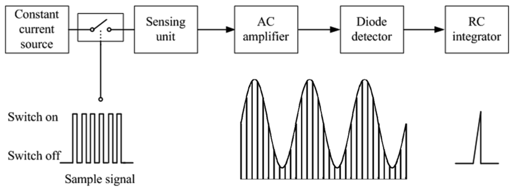 We propose a method of pulse amplitude modulation (PAM) for indirect inductance measurement without using a variable-frequency oscillator [15,16]. For one RIP sensor, large current from a constant-current source is fed to it momentarily and periodically, and its inductance is measured during the pulse excitation period. Different from Sinton's design, the feeding current is not flowing through the inductive sensor continuously. Thus the power consumption is reduced dramatically with the technique of PAM, without losing sensitivity due to the momentarily large feeding current.