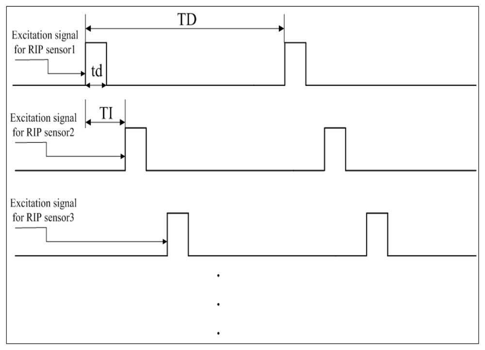 Based on PAM, the TDM technique is further implemented to support multiple RIP sensors. Figure 2 illustrates how TDM works. All the RIP sensing units are excited one-by-one by the same current source, and at each time there is only one sensing unit connected with the current source. As shown in Figure 2, the first RIP sensor is excited in the application time of ‘td’, then the second RIP sensor will be excited after time of ‘TI’. For each RIP sensor, the application time is the same as ‘td’, and the excitation period is the same as ‘TD’. Thus the sampling rate for each sensing unit is [1/TD] and the number of RIP sensors that can be supported by this module theoretically is [TD/TI]. Because there's only one RIP sensor working at any time, this method can avoid the cross-talk between RIP sensors effectively. As the impulse response of the sensing unit is approximately 40 μs (see below the section on the sensing unit), the width of TI should be at least 40 μs longer than that of ‘td’.