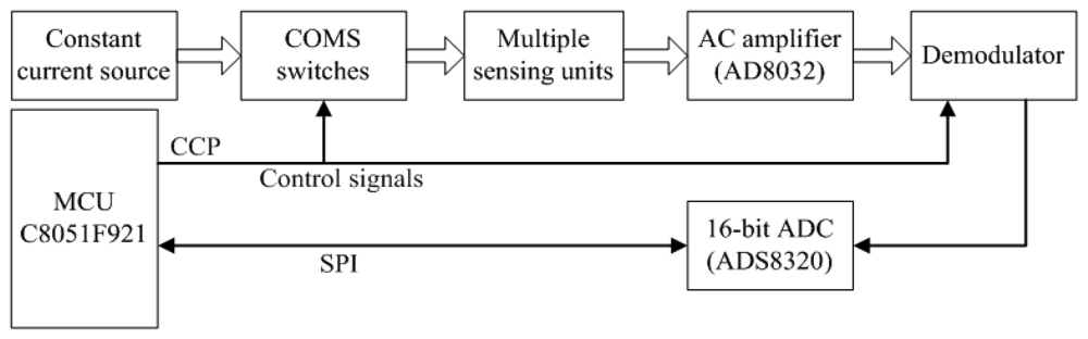 For multiple RIP systems, the approach of combining PAM with TDM can further reduce the power consumption of the whole system, without increasing the signal conditioning circuits by multiplexing for all sensing units. Thus the low power consumption and compact size of PCB can be guaranteed. In our RIP module, the constant-current source and signal conditioning circuits including AC amplifier, demodulator, and RC integrator are multiplexing for all sensing units.