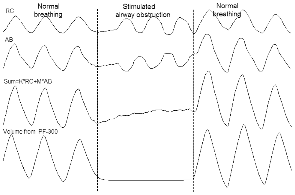 Figure 7 shows the simultaneous recording of ventilation from PF-300 and respiration trace of RC and AB from RIP during normal breathing and simulated airway obstruction. The weighted sum output was formed by adding the RC and AB signal multiplied by its volume/motion coefficients obtained from the QDC procedure. True paradoxical breathing can be observed during the stimulated airway obstruction, and the derived value of lung volume from our RIP values by thoracic and abdominal movements is consistent with the PF-300's volume value.