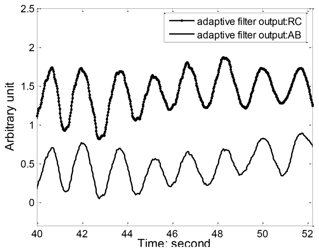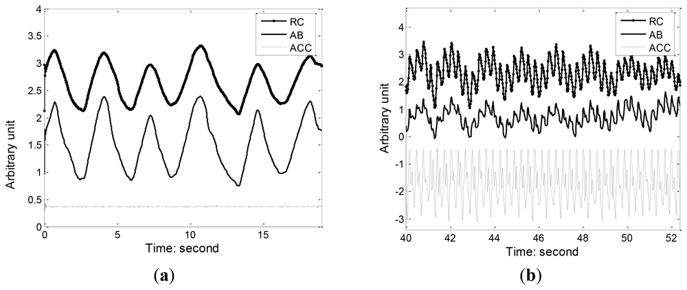 Figure 8 illustrates the RC and AB respiration and accelerometer (ACC) reference signal during standing and running. We can see that running movement can insert a large amount of motion artifact and distortion into the respiration waveform, making it hard to detect the onsets and peaks of each breath. Since running is accompanied by toward accelerations that can be captured the ACC, we used the adaptive filtering to recover the respiration component from the movement contaminated RIP signal. Figure 9 shows the results of adaptive filtering using least mean square (LMS) algorithm. For LMS implementation, the length of the filter is 50, and the step size is 0.01. A moving average filter followed the LMS adaptive filter to make the respiration waveform cleaner. As ACC offers a practical and low cost method of objectively monitoring human movement, ACC has been widely integrated in most wearable systems and its outputs were used as references for adaptive filtering of motion artifact. Keenan DB [26] also demonstrated the application of wavelet and LMS adaptive filtering to improve the accuracy of respiratory measurement with ACC as reference signal.