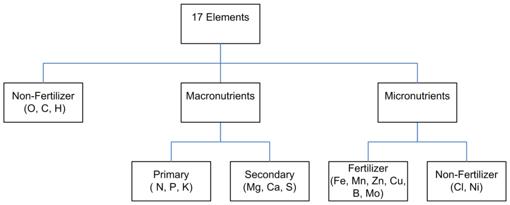 The essentiality of an element is determined through the exclusion of the suspected nutrient and observations on the physiological impacts of that exclusion. If the plant cannot survive in the complete absence of the element then it is by definition an essential plant nutrient. There is still debate regarding the essentiality of some micronutrients as the amounts required for plant survival are extremely low (e.g., nickel) and it can be exceedingly difficult to exclude them with full confidence. As such, there are anywhere from 15 to 18 reported essential plant nutrients that govern plant growth, development and reproduction [2,25,26]. Three elements, oxygen, carbon and hydrogen, can be considered non-mineral or non-fertilizer nutrients as these are obtained directly through CO2 and H2O via photosynthesis. In comparison, the remaining essential elements are obtained from the soil, the fertigation solution, or through atmospheric deposition leading to foliar uptake. Nutrients can also be classified according to the quantities required by the plant with those required in relatively large quantities termed macronutrients and those required in lesser quantities termed micronutrients as portrayed in Figure 4.