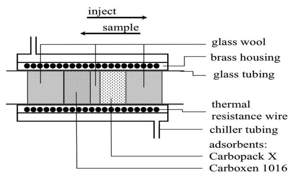 The preconcentration of samples was achieved using a custom designed thermal desorption (TD) unit (UniTemp, Cape Town, South Africa). A brass tube containing a resistance heating wire housed within a brass water jacket. The jacket was cooled with a glycol solution at −15 ± 0.2 °C from a commercially available recirculating chiller (Figure 1). A glass tube housed 9 mg each of the two adsorbents (Carbopack X/Carboxen 1016) within the brass trap (Figure 1). These adsorbents preferentially remove and trap volatile halogenated organic compounds (VHOCs) from the air.