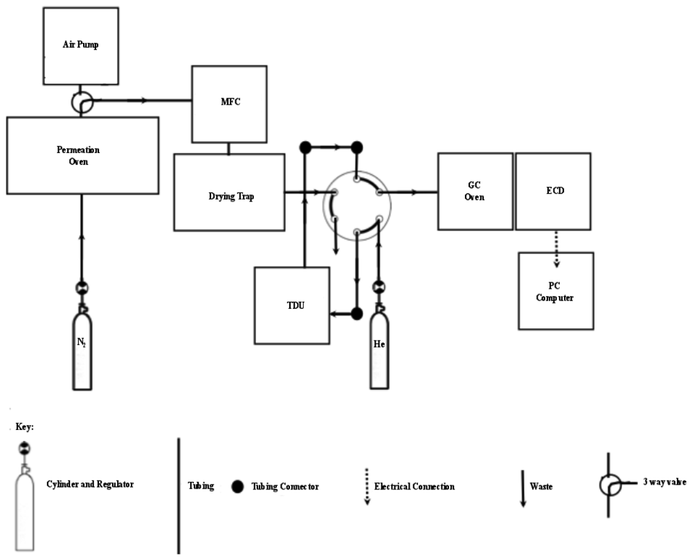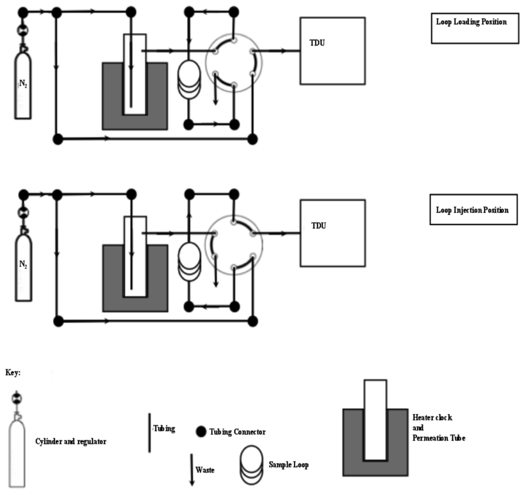 Grade 5.0 nitrogen (Air Products/Air Liquide, Cape Town, South Africa) was introduced to the trap, replacing the air sample, in order to demonstrate that the system was able to produce a null result and that there was no carryover of bromoform from previous runs. The introduction of nitrogen was performed in the same manner as air or permeation gas, via a 3-valve (Figure 2), controlled through the mass flow controller at 100 mL·min−1 and passed through the six port injection valve set in the ‘load’ position and finally on to the adsorbent trap. The TD trap was maintained at −10 °C for the 15 min trapping period resulting in a 1.5 L sample volume. The procedure to ensure there was no carryover was performed on a daily basis, after each calibration point and every 5th air sample.