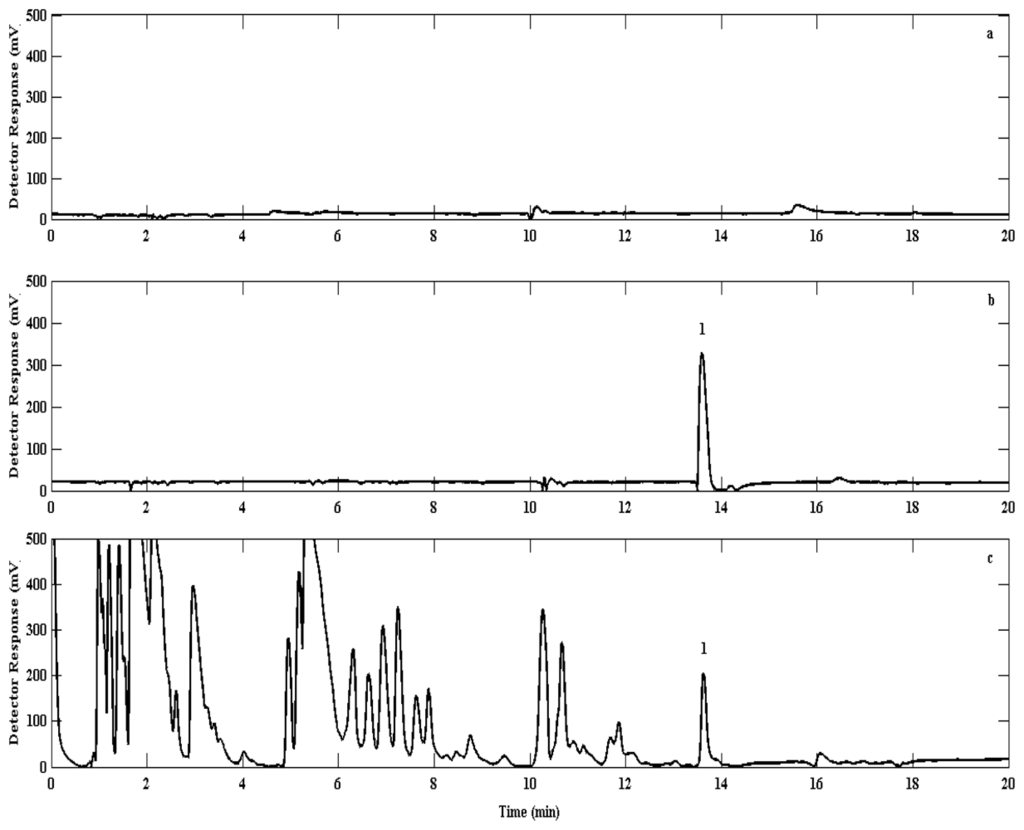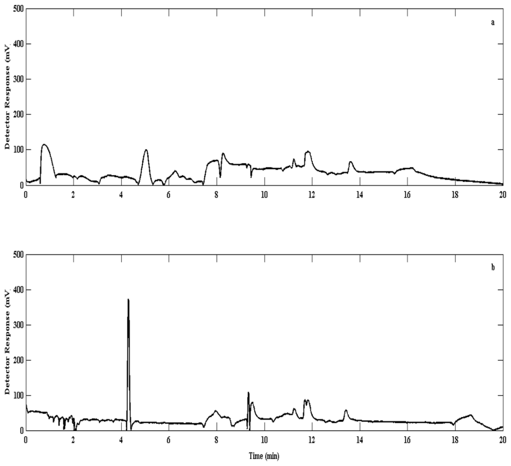 Switching between loading the sample onto the cooled trap and injecting the sample onto the column when the TD trap was heated was controlled by a six-port injection valve (Figure 2). A flow of 100 mL·min−1 through the trap was controlled with an ASM AFC-260 mass flow controller. Moisture was removed by magnesium perchlorate supported by plugs of glass wool in a small pipette [24]. The analogue ECD output was converted to a digital signal via a combination of Advantech ADAM 4017 and 4052 units and sent to a computer. MATLAB was used: (1) to develop a customised front end graphic user interface (GUI) for the real-time collection and display of the ECD signals, and (2) for the post run integration of chromatographic peaks.