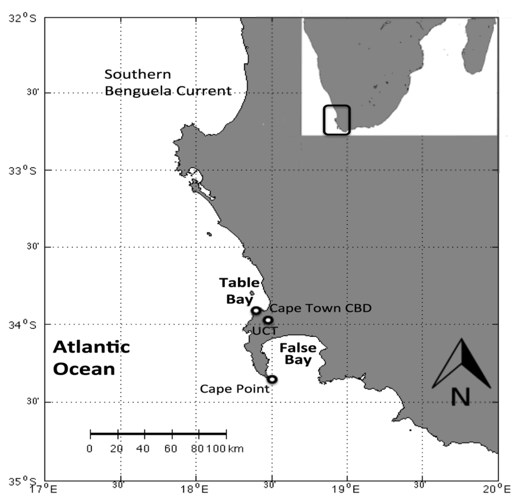 From a marine perspective, the southern African region is of specific importance due to a wide range of marine habitats, which can be considered a natural laboratory for the comparison of bromoform production in widely differing marine environments. Southern Africa borders three diverse and globally significant ocean basins: the Indian, Atlantic and Southern Oceans. The geographical position of Cape Point in southwestern South Africa allows for the study of warm-ocean, rocky shores and ice-influenced waters all from one fixed point. Furthermore, it is situated within one of the world's most biologically productive upwelling systems, the Benguela, making it ideal to investigate the suggested link between bromoform and the observed high productivity [22].