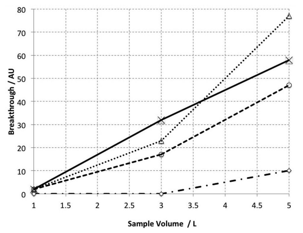 Quantitative trapping tests showed no significant breakthrough of bromoform with sample volumes up to 3 L at ambient temperatures, whereas significant breakthrough occurred at 5 L (Figure 7). For more volatile compounds (unidentified but with constant retention times (tR) from 2–3 min), significant breakthrough was found to occur from 1 L. This implies that our method as described here is suitable for bromoform analysis within sample volumes of up to 3 L however; more work is needed to demonstrate whether this method is suitable for low molecular weight VHOCs.