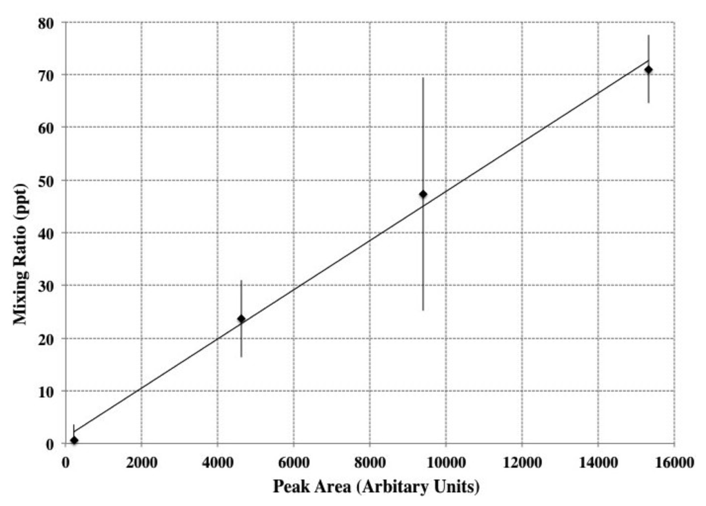 Calibration for bromoform showed that the system was linear within a range of concentrations of 5–90 ppt. Concentration vs. Peak Area gave R2 = 0.9 (Figure 8). The detection limit was determined to be 0.73 ± 0.09 ppt and the precision was found to 12.7% based on nine repeat 200 μL volume injections of bromoform standard.