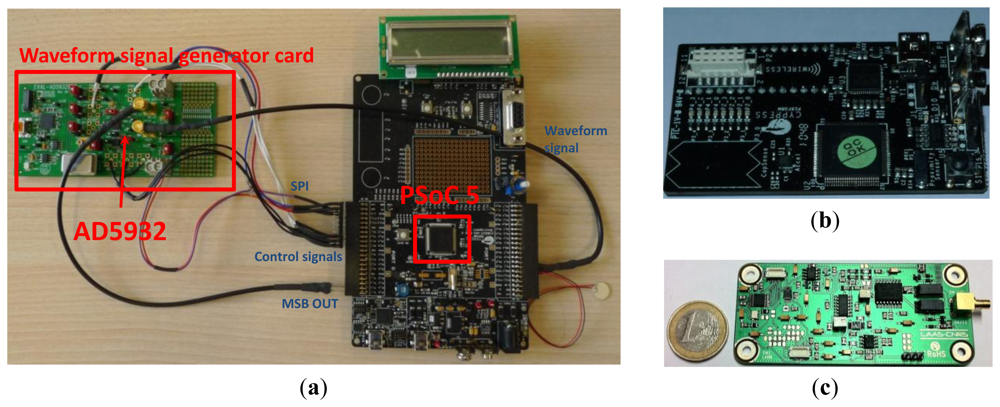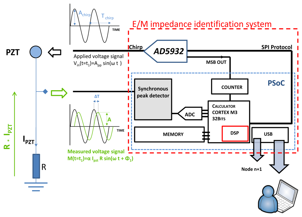 After we demonstrated the feasibility of E/M impedance calculation using a linear chirp excitation signal, we propose to miniaturize the test bench presented in Figure 3(b) using an embedded system. The the Agilent 33220A laboratory instrument was replaced by a programmable single scan waveform generator chip, the AD5932 manufactured by Analog Devices capable of providing a pure sine wave output signal with a linear frequency sweep increment up to 25 MHz [28].