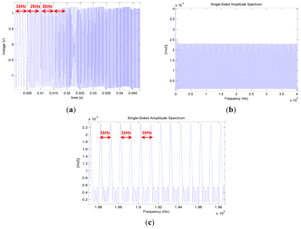 As presented in Figures 10 and 11, the applied stimulus voltage signal is generated by the AD5932, which was programmed using an SPI protocol to output a sine wave signal going from 1 kHz to 400 kHz with a step size of 1 kHz. The frequency increase is automatic and occurs after each 5.1 ms. Finally, the excitation signal lasts 2.05 s. In opposed to the chirp generated using the Agilent 33220 presented in Figure 5, the excitation signal generated by the AD5932 presents a non-continuous frequency variation (cf. Figure 12(a)). Because of the implemented incrementation of 1 kHz, the spectral response has a spiked shape (cf. Figure 12(c)).