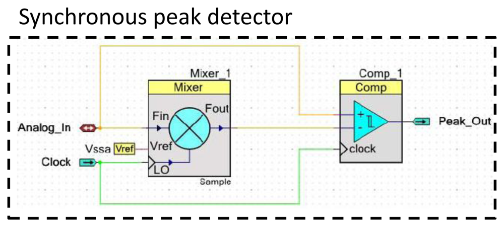 The synchronous peak detector comprises a down-mixer acting as a sample and hold block followed by a comparator with approximately 10 mV of hysteresis. The sample and hold induces a time delay on the input signal. This signal is afterwards compared using the hysteresis comparator to the original signal. As presented in Figure 13, the time delay created by the down-mixer is fixed using a selected sample clock. Its value is critical because it fixes the resolution of the detection. A clock that is too fast will create erroneous triggers due to oscillations at the comparator output (cf. Figure 14(a)). However, the peaks are missed when the sampling clock is too slow (cf. Figure 14(b)).