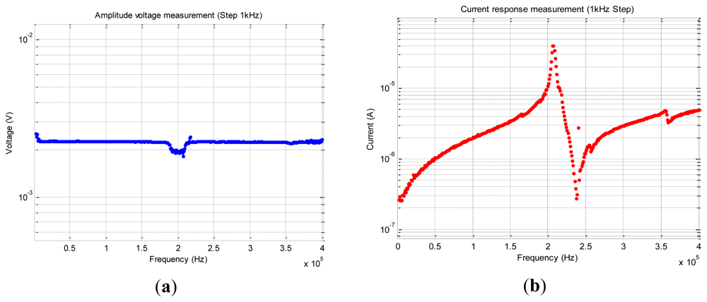 Using the simple circuit presented in Figure 3(a) we apply the excitation signal to the PZT patch presented in Figure 4 and measure its current response through the resistance Rc. This should be small (∼Ω) to not influence the resonance quality factor of the sensor.