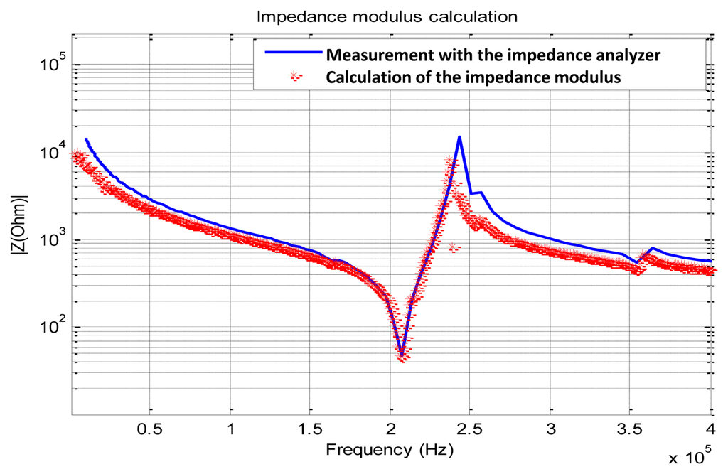 Using the data presented in Figure 5, we plot the modulus of the complex sensor's impedance by applying Equation (6) and we compare it to the measured |ZPZT (jω)| using a calibrated impedance analyzer Agilent 4294A (cf. Figure 1(a)):