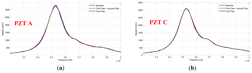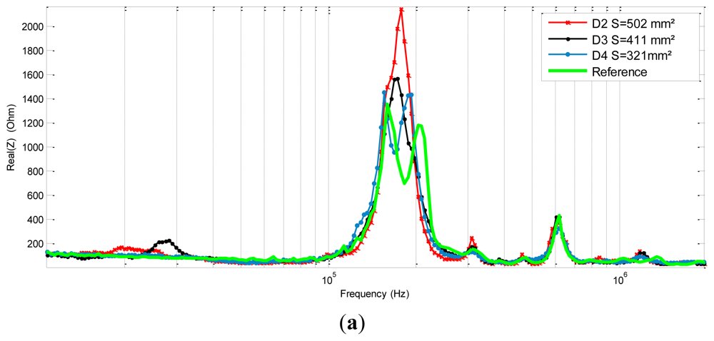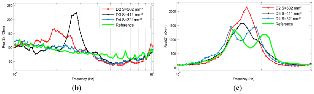 As shown in the literature [17,26,27] the electromechanical impedance technique is, contrary to modal analysis, efficient at higher frequencies (10 kHz–600 kHz). In this range, the wavelength of the excitation is very small, which allows for an accurate detection. The real part impedance spectra of the PZT sensors show different responses at many intervals. These differences seem to be more significant at lower frequencies but also around the first resonance and anti-resonance first mode of the piezoelectric sensor (cf. Figure 9). In this interval, we can clearly notice a peak shift and amplitude change. It is also interesting to see that for the reference signature and for the D4 response the signals have two main spikes between [100 kHz, 300 kHz] while the others have only one.