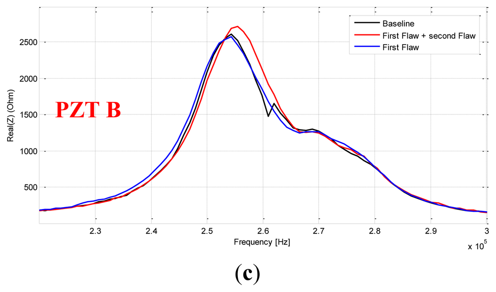 As before, our diagnosis principle is based on a comparison between a healthy response considered as the baseline and other responses captured after damaging events. As seen in Figure 18(a) we used three PZT patches pasted onto the front side of the structure at 2 cm above the stiffener, at its position and finally at 3 cm under its position. Two damages were artificially introduced using a miniature circular saw to simulate cracks. We captured the sensors' response after and before the introduction of each defect. As depicted in Figure 19, the first crack is at 3 cm from the skin and has a size of 2 cm and the second one has a size of 3.5 cm and is at 0.5 cm distance from the structure skin. All the damages were introduced before the attachment of the sensors. The idea behind this to make a system that is easily mountable and removable. Because of certifications issues the idea is to manufacture a system cable to probe some critical parts in a plane on the ground after a fixed hours of flights. Although, we focus our studies on a narrow band of frequency [230 kHz, 300 kHz] to reduce the amount of the processed data and thus makes the inspection time more efficient. The measurements were performed 10 times for each sensor. If we compare the responses of each PZT at the interval range going from 220 kHz to 300 kHz, we notice that the impedance spectrum responses of the sensors A and C stay almost unchanged after and before the introduction of the two damages (Figure 20). However, the responses of the PZT B show frequency shift between 250 KHz and 270 KHz. We also notice that spectral impedance value of the PZT B is linked with the health of the structure as in the case of delaminations.