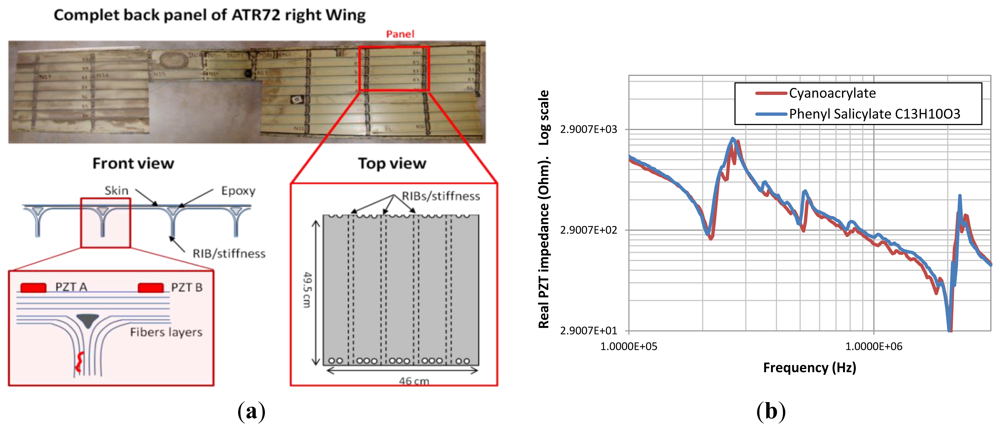 To demonstrate the feasibility of delamination detection in composite aircraft structures using our developed method, we artificially introduced three defects located at different zones using a calibrated impact machine. The impacts were applied from the upper face of the structure. The sensors presented in Figure 1(c) were pasted after the impact tests onto the upper side using a phenyl salicylate (C13H10O3) polymer that offers the unique advantage of polymerizing at 40 °C and depolymerizing at 60 °C, which is lower than the PZT material's Curie temperature. In other words, we can stick and remove our sensors without affecting their piezoelectric proprieties. Moreover, measurements (Figure 7(b)) show that the phenyl salicylate polymer offers the same coupling between the sensor and the structure as cyanoacrylate glue. As presented in Figure 7(a), an aircraft specimen of 49.5 cm × 46 cm was extracted from the right wing panel of an ATR72.