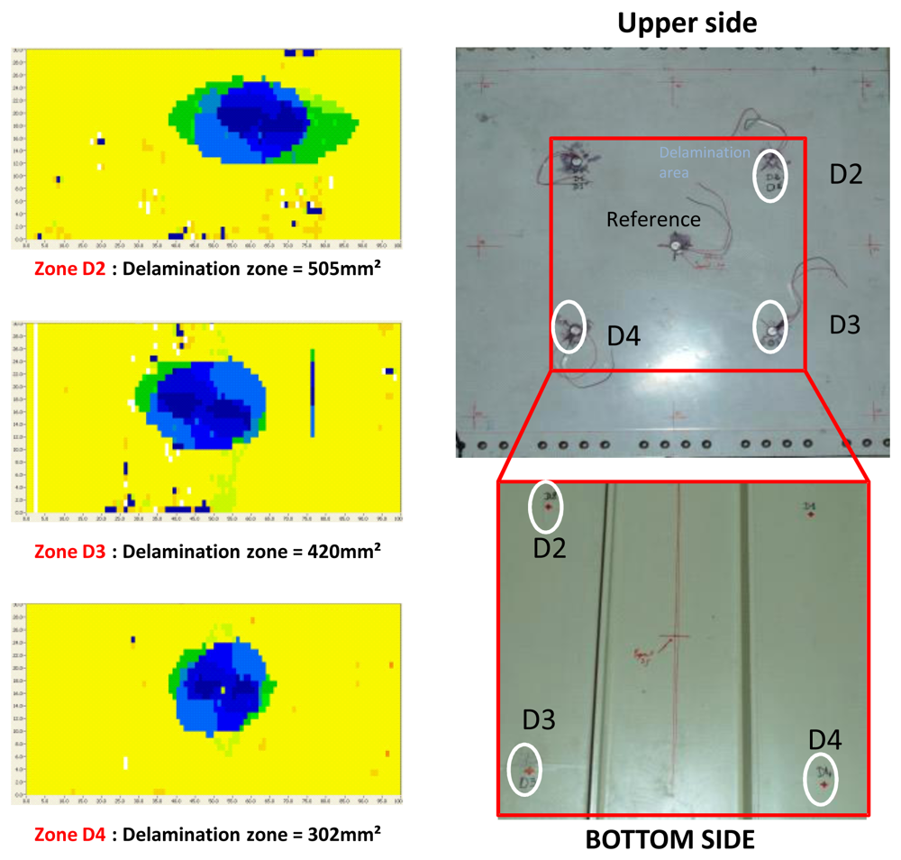 A C-scan using a commercial NDT tool was performed to check the integrity of the structure and to quantify the artificially introduced damages' sizes. The damage D4 is situated deep inside the structure and is totally invisible from the upper or bottom side. The damages D3 and D2 are visible from the bottom side, while still totally invisible from the upper side. For high energy impacts, this phenomenon is typical behavior of composite structures (cf. Figure 8).