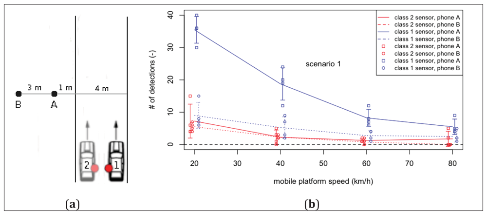 With a class 2 sensor, the difference is nearly negligible. Again there does not seem to be an indication, however, that this distance blocks the methodologies usability. Next, the position of the sensor on the mobile platform needed to be investigated. Since it was not possible to mount an antenna on the rooftop of the car, it had to be placed inside of the car. Prior experiments had shown the rear side window being the best location in contrast to the ceiling or the front windshield (not shown). It was not known, however, what the effect was of the sensor either facing or not facing the side of the road with detectable phones. This was tested by performing passage runs at a speed of 60 km/h under both scenarios (Figure 3(c)). Contrary to what could be expected, both phones were detected more often when the sensor was not facing them (scenario 2) although the difference is clearly not statistically significant. The difference between both phones is more pronounced, showing that the effect of the distance is larger than that of the sensor placement in the car. In order to minimize the probability of missing detectable phones, the mobile platform was equipped with a class 1 sensor on each side during the actual case study experiment described in the next section.