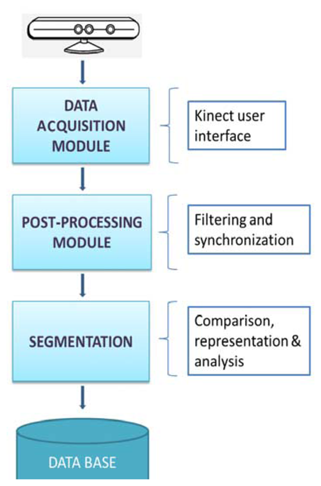 According to the methodology to follow during the execution of the experiment, Figure 2 shows a block diagram representing the whole process designed since the data acquisition from the Kinect™ to the plot and analysis of the signal.