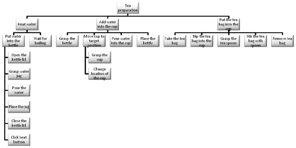 While the decomposition of an activity in component tasks is common across a range of disciplines, Human Factors (particularly in the UK) employ a methodology called Hierarchical Task Analysis (HTA) [44]. What is important in this approach is not simply the hierarchical decomposition but also the definition of ‘plans’. As in the psychological studies of Cooper and Shallice [33], hierarchy is typically described in terms of decomposition of a “goal” into “subgoals”, moving from a high-level objective to lower-level tasks. In this case and based on HTA, the whole task tree designed for the project and experiments regarding the task focused on tea preparation is shown in the next Figure 4.