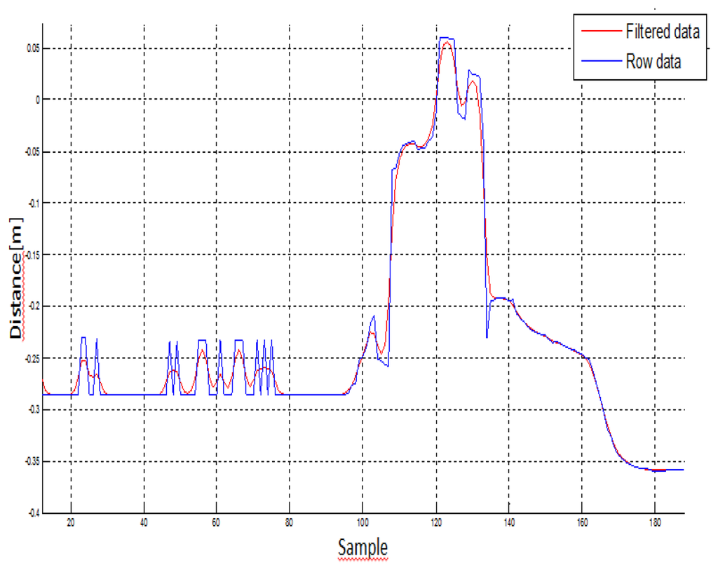 In the first step of data analysis, the kinematic data was loaded in a custom written MatLab program (The MathWorks®, Version R2010a), and the 3D coordinates were low-pass filtered at a 5 Hz cut-off, using a first order Butterworth filter. The data was also filtered using an infinite response filter, which was selected because it reduced the amount of delay in the signal. It is known to be more computational efficiency than a finite response filter. This low-pass filter adequately smoothed the signal, rejected movement artefacts and high frequency phenomena (e.g., aliasing), and eliminated power line harmonic interferences. Figure 6 shows the signal before (blue signal) and after (red signal) filtering Kinect™ data:
