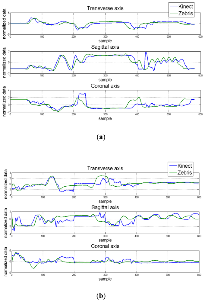 In the next step, the Zebris data was then down-sampled to 30 Hz and then normalized by computing standardized z-scores using the mean and standard deviation of the vector for each axes (transverse, sagittal, coronal). This procedure allowed the comparison of the obtained data from the two motion capture systems to be done directly. The differences between the Kinect™ and Zebris data were quantified utilizing Mean Square Error (MSE) and cross-correlation measures separately for each axes. MSE was computed using the matlab mean squared normalized error performance (mse) function, which measures the expected squared distance between an estimator (Zebris) and the observations (Kinect™). A MSE of 0 means the estimator (Zebris) predicts observations (Kinect™) with perfect precision. Larger MSE values indicate that the observation values (Kinect™) differed from the estimator (Zebris).