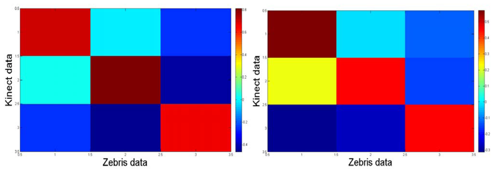 Notice from Figure 8 that the correlation map from the trials with the control participant is more symmetric than that one for the apraxic participant due to that the transformation between axes from the Zebris and the Kinect™ is more linear because of different set up configuration. The data was considered and processed consequently.