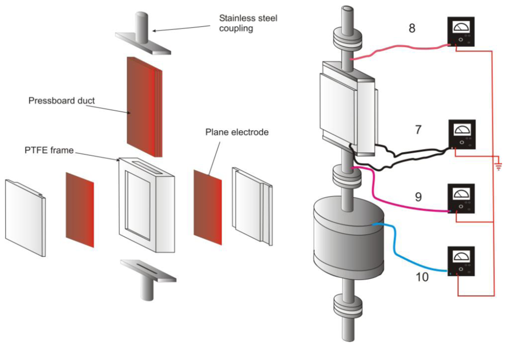 The sensor (Figure 2) consists of a rectangular pressboard channel (3 × 30 mm2 cross section, and 300 mm in length) made of 3 mm thickness pressboard sheets stuck together and inserted in a PTFE frame. Two stainless steel electrodes (240 × 50 mm) are placed facing the largest external surfaces of the pressboard duct embedded in the PTFE frame. 2 mm thickness of PTFE insulates the pressboard from the electrodes. Connected to a picometer (Keithley 610C), these electrodes allow measuring a capacitive current called the accumulation current (7) correlated to the charge trapped on the pressboard surface and to the local potential increase. This configuration intends to simulate the pressboard parts inside power transformers which have high leakage impedance having regard to the imposed potential (windings and tank). The increase of the electric potential favors the migration of trapped charges on the solid surface to the ground. The electrical leakages occur upstream and downstream of the PTFE frame towards the two stainless steel tubes. Insulated from the rest of the loop by PTFE flanges coupling, and connected to two ammeters, these tubes allow measuring two currents called respectively upstream and downstream leakage currents (8–9). Moreover, the liquid charges are carried by the flow into the relaxation vessel (Figure 1, number 5). According to the rates of oil flow and electrical properties of the oil, the reservoir volume of 10 L is sufficient to allow the complete relaxation of charges in the liquid. The resulting current, measured with a fourth pico-ammeters, is the streaming current also called the generating current (10). The dimensioning of the different parts of the loop is very sensitive and strict, especially the PTFE flanges. Thus, the thickness of the PTFE flanges must be sufficient to ensure the electrical insulation from the rest of the loop and not too thick to produce charges due to the oil flow on their surfaces. The geometry of the electrodes must allow distinction between the solid charges which leak at the solid/liquid interface to the ground direction, and the liquid charges carried by the flow. In the first version of the sensor only the accumulation current was measured. The interpretation of measurements gradually led to complete the loop with three additional current measurements.