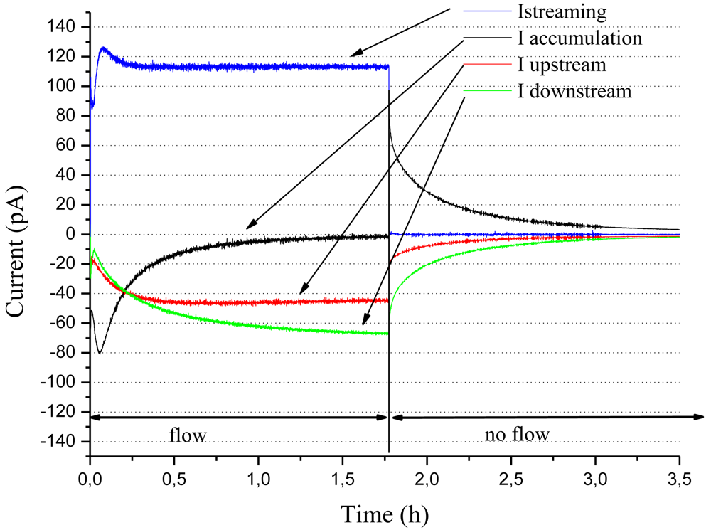 As soon as the oil starts to flow, a charge is generated at the interface. Positive charges in the oil are carried away by the flow and induce the streaming current which passes by a maximum value before reaching a steady state. In the same time, opposite charges are trapped inside the solid pressboard. The magnitude of the accumulation current increases and comes back more or less rapidly to zero. The surface potential increases, until reaching a steady state leakage current toward the grounded outlet and inlet ducts through paths along the interface. The dynamic of the transient state, the magnitude of the streaming current and the maximum value of the accumulation current depend on the oil/pressboard pair. When the oil flow is stopped, the continuous charge separation process stops at the interface and all solid charges leak to the ground. Accumulation current is then positive with negative leakage currents. It can be checked that the sum of the leakage (inlet and outlet), accumulation and streaming currents is equal to zero at all time.