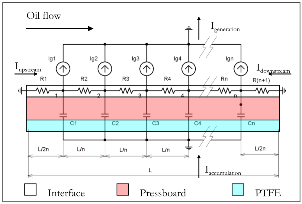 The electrical equivalent circuit allows representing this measurement system (Figure 4) [24,25]. The physicochemical phenomena at the interface which create the charges on the solid act as current generators distributed along the solid/liquid interface. The streaming current due to the convection of the liquid charges is equal but opposite of the current generation. The magnitude of these generating currents is decreasing from the duct entry due to the electrical double layer development along the interface. Resistor components are correlated to charge leakage in inlet and outlet pressboard duct. The resistor interface is linked to the electrical properties of the solid/liquid interface modified by electrical double layer charges. Finally, capacitors are associated to the electrical permittivity of both the solid (pressboard, PTFE, electrical cable) and the liquid. They are considered as constant along the duct.